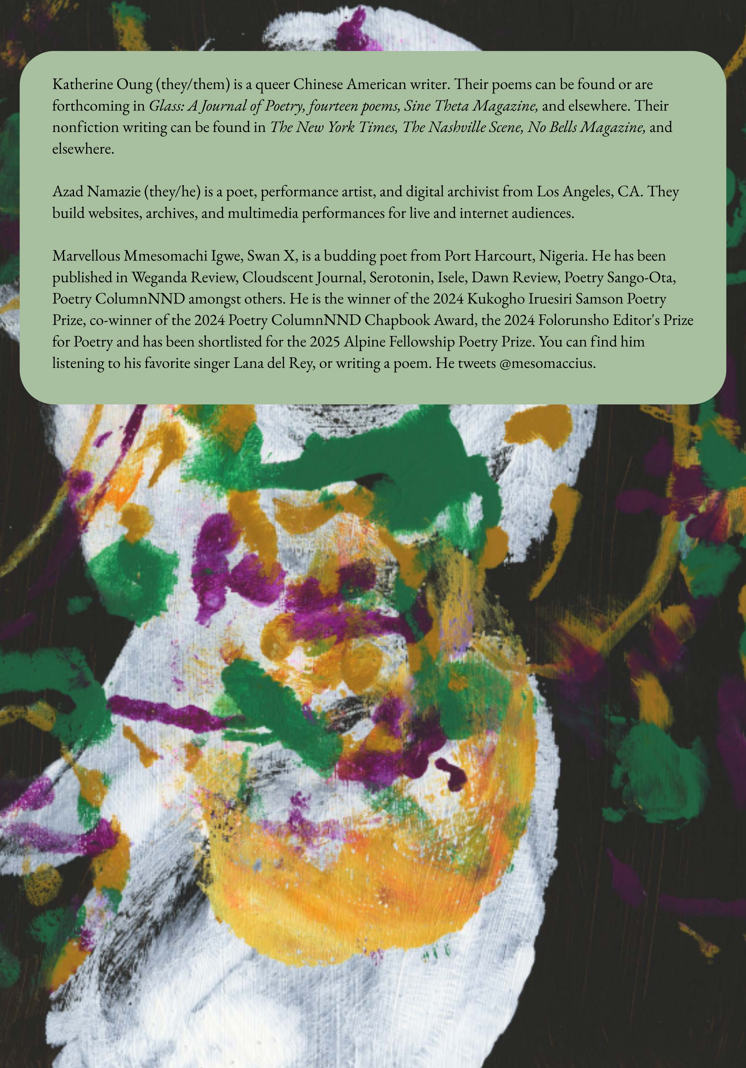 Thank you to all of our contributors and everyone this issue reaches. We hope that you find it as powerful and as beautiful as we do.